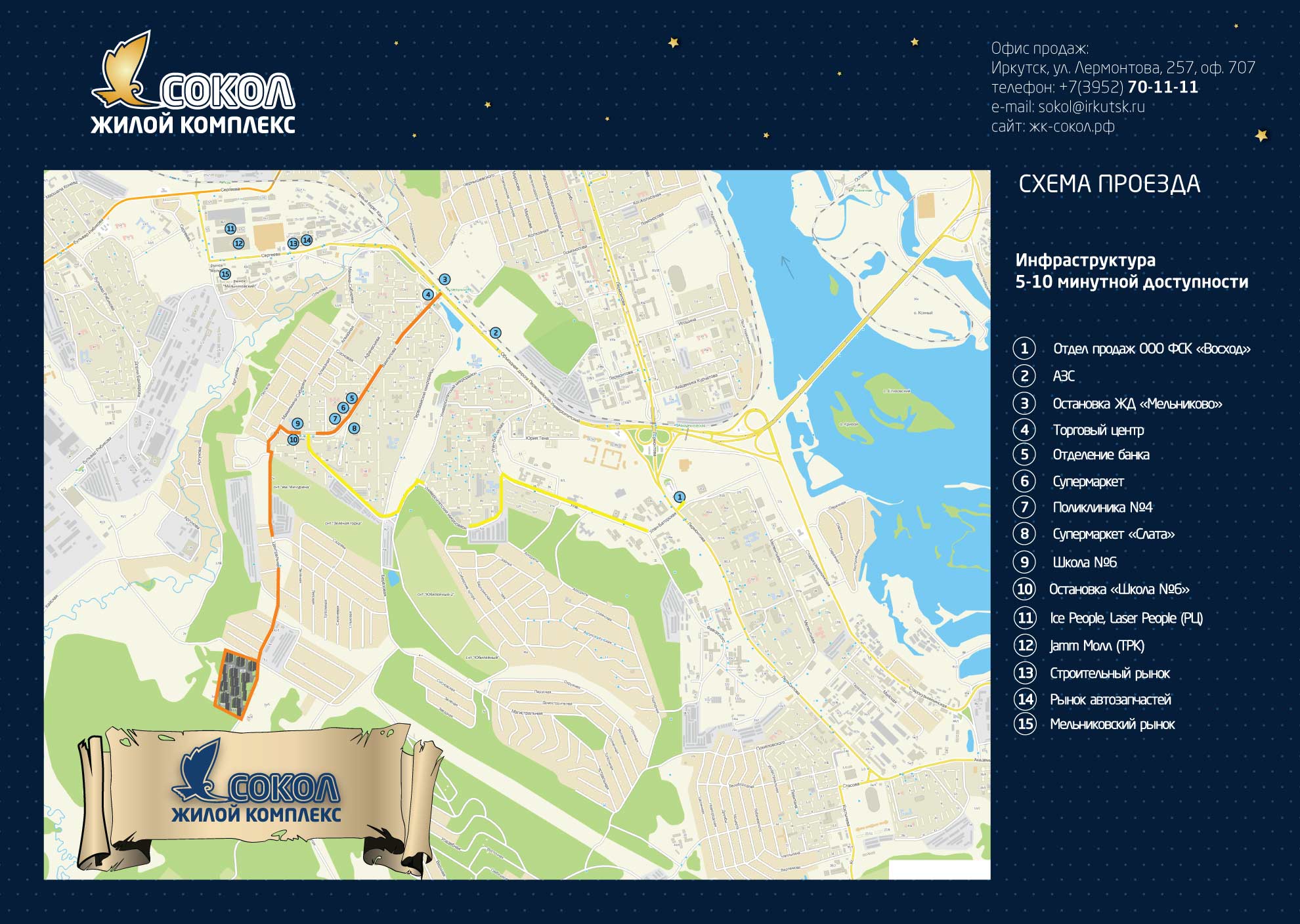 Жилой комплекс «Сокол» расположен южнее микрорайона Первомайский. Ново-Мельниково, Центральная, 1( согласно справочнику 2ГИС).